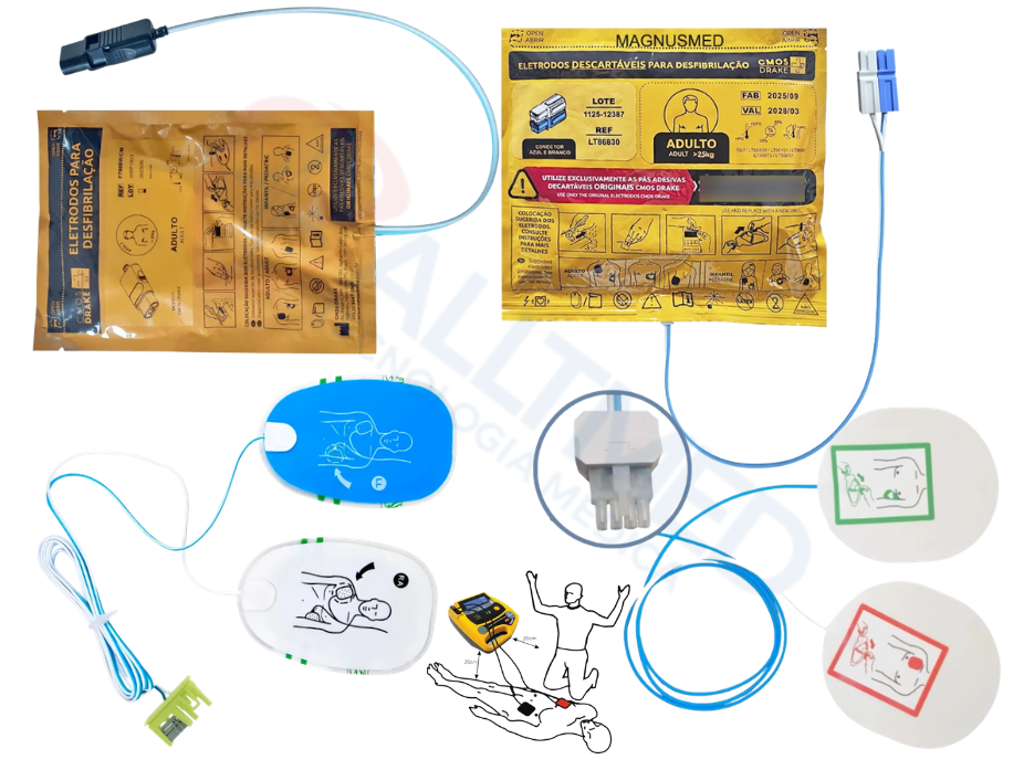 Os eletrodos para DEA pás adesivas descartáveis que conectam o paciente ao aparelho para pronto atendimento.